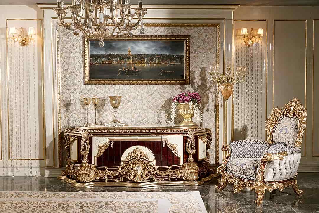 Colorful armchairs, leaf embroidered mirrors, large showcases and embroidered headboards with a magnificent look...